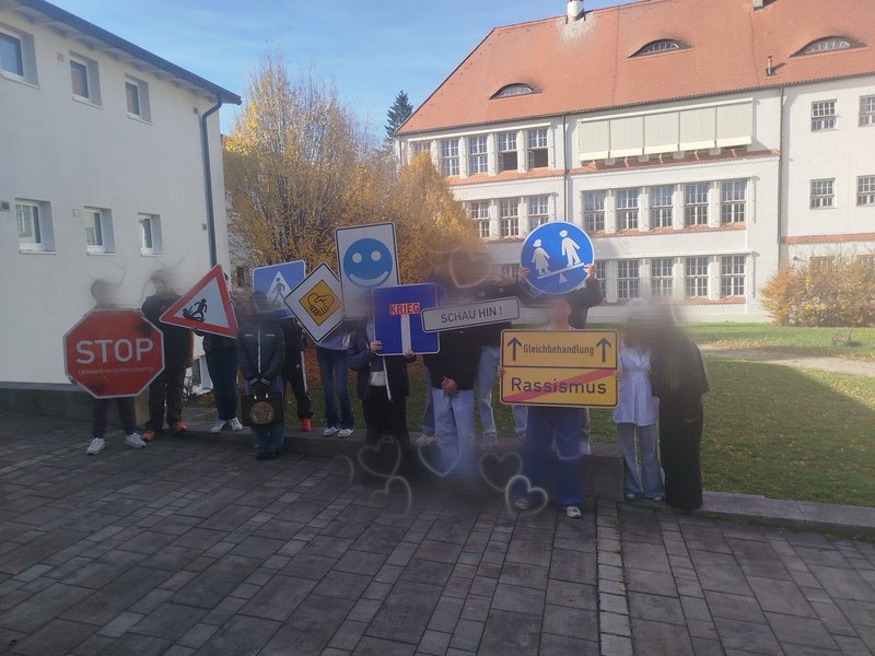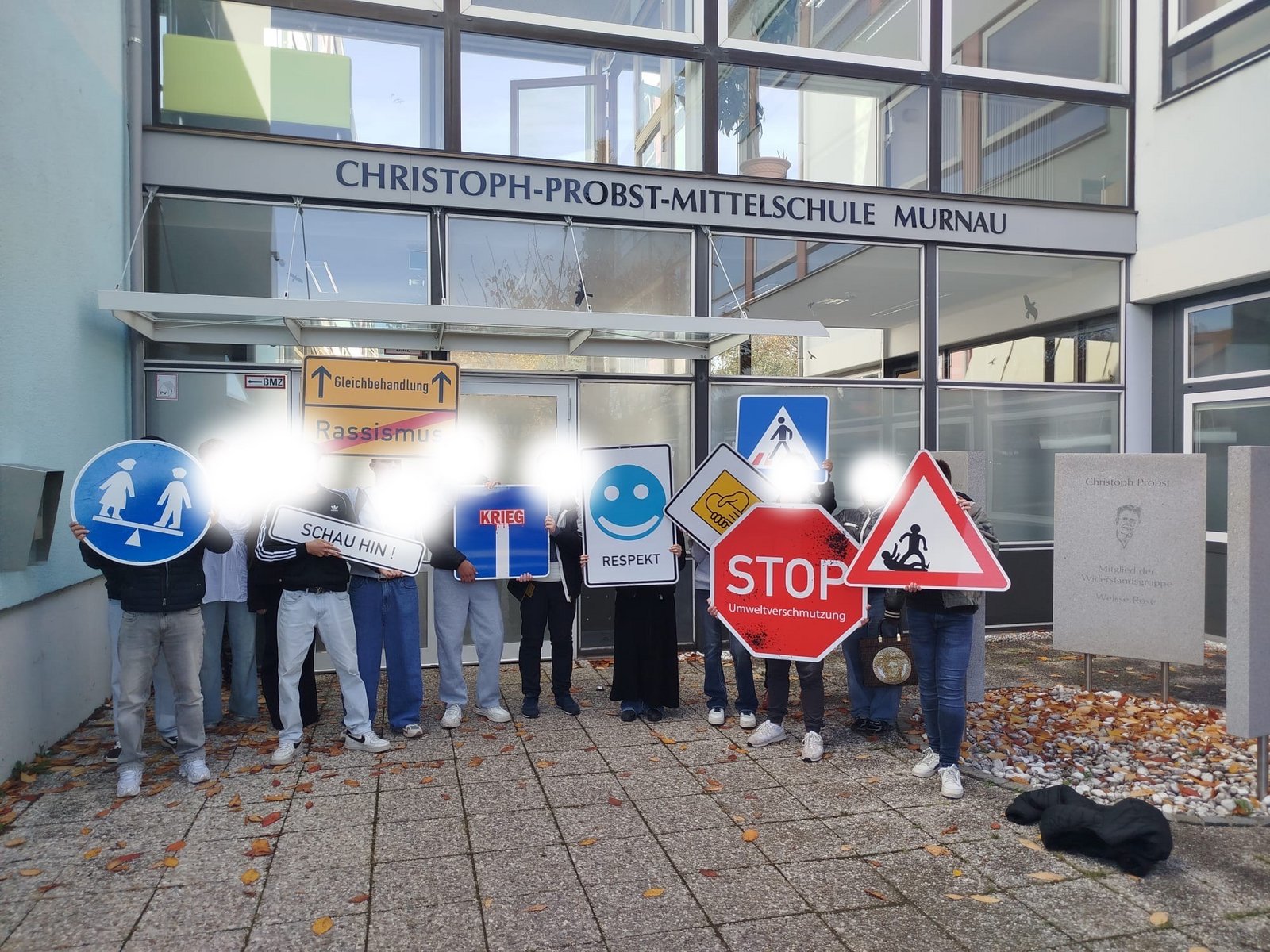 Am letzten Schultag vor den Herbstferien fand im Ethikunterricht der 9. Klasse ein besonderer Schilder-Umzug statt: Die Verkehrsschilder der Gerechtigkeit sind von der Emanuel-von-Seidel-Schule an die Christoph-Probst-Mittelschule gewechselt und bereichern nun für eine gewisse Zeit unsere Schule.