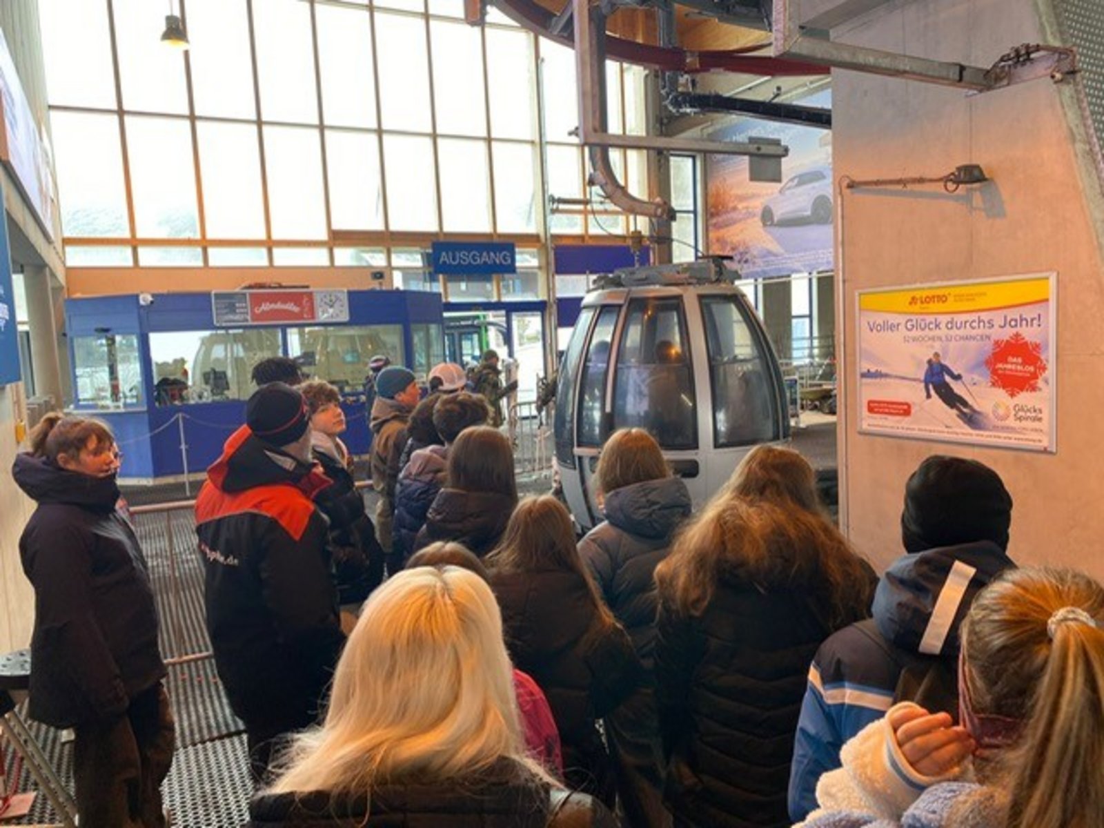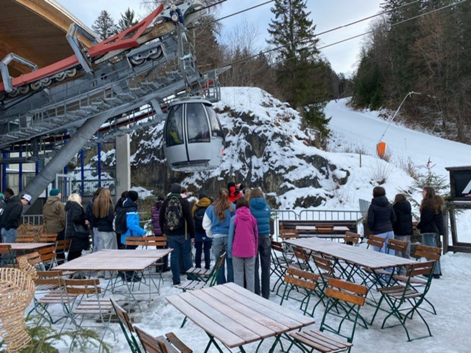 Das Highlight des Tages war natürlich die gemeinsame Fahrt mit der Seilbahn auf den Berg. Herr Rachieru, Frau Fischer und die 8M fuhren bis auf über 2.000 Meter Höhe zum Osterfelderkopf und konnten dort einen atemberaubenden Ausblick auf die verschneite Berglandschaft genießen.